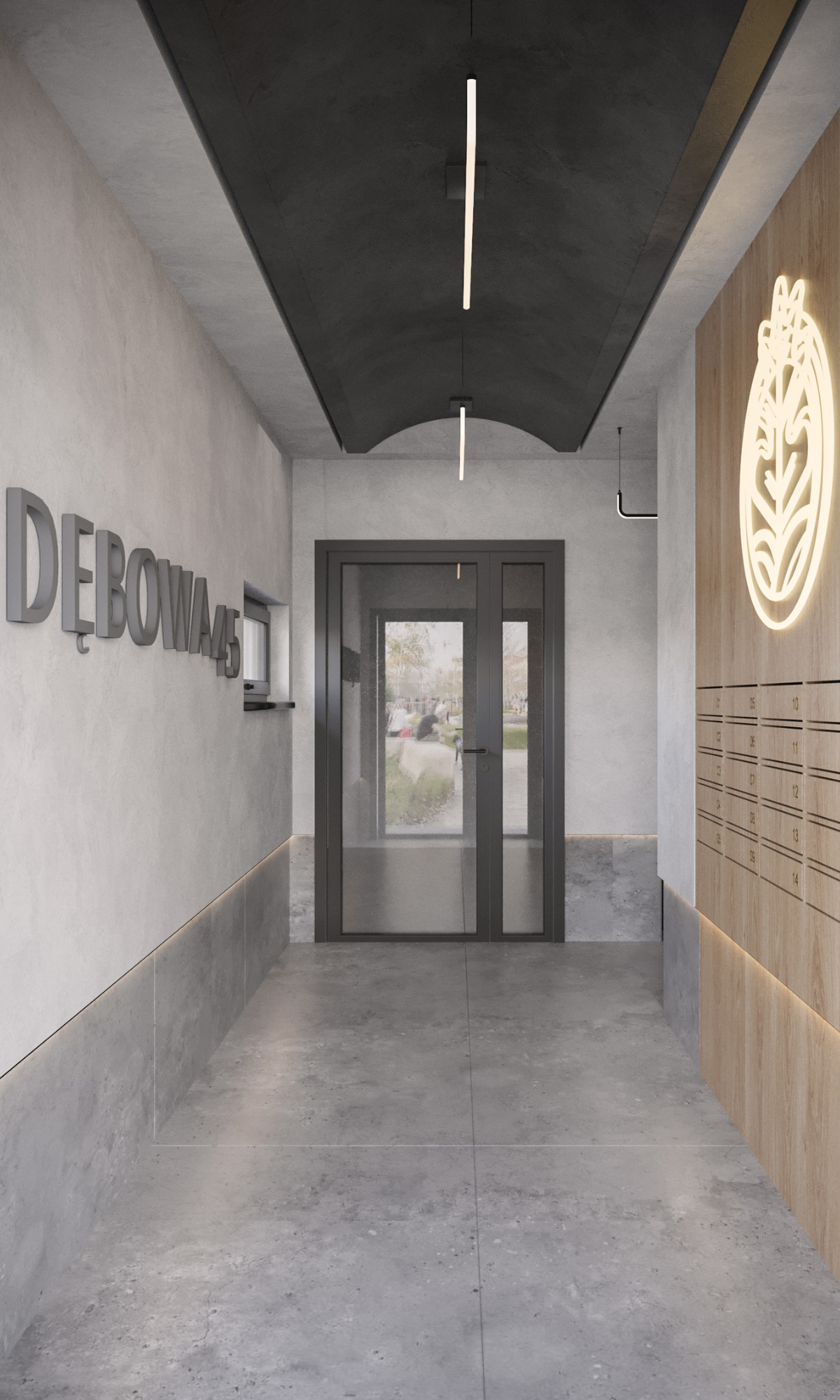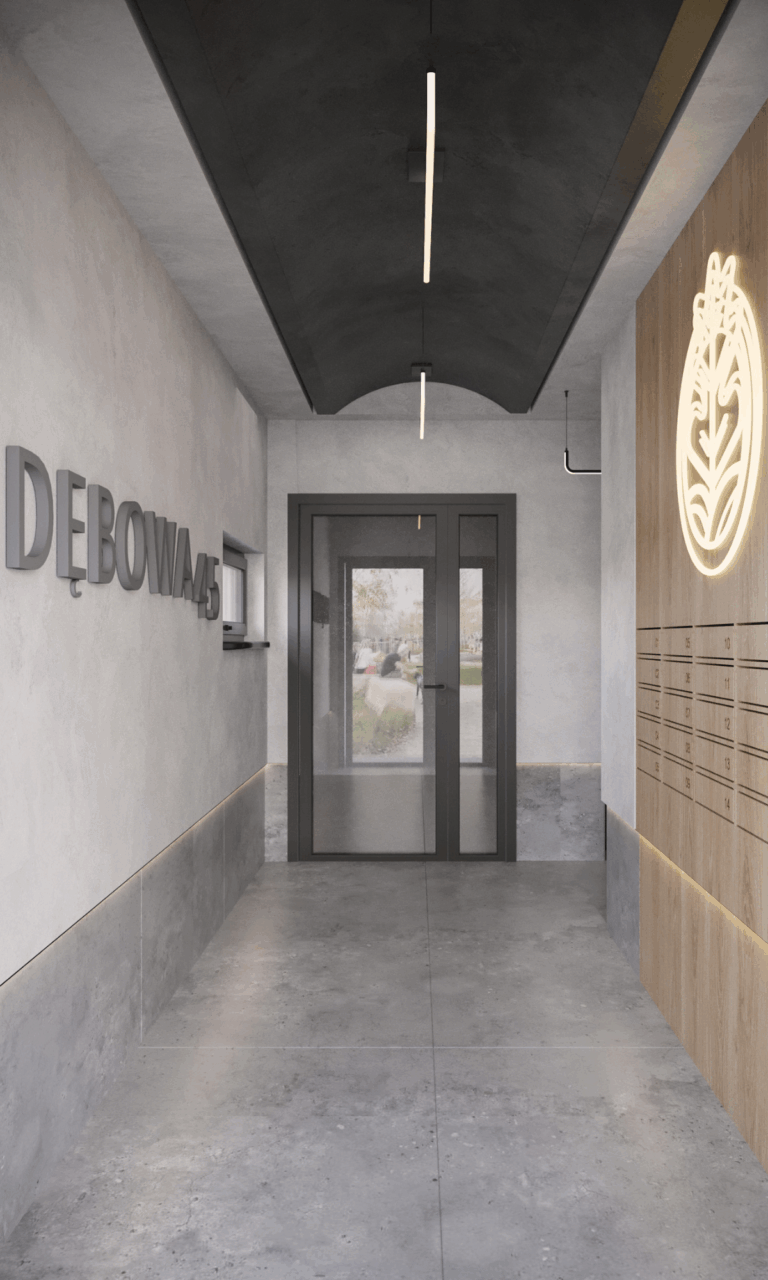 Dębowa 45 to budynek mieszkalny, który obejmuje 50 komfortowych mieszkań i 9 lokali z ekspozycją na południe, wschód i zachód, co gwarantuje słoneczne wnętrza przez większość dnia. Budynek został zaprojektowany z myślą o wygodzie, łącząc estetyczną architekturę z funkcjonalnymi rozwiązaniami.