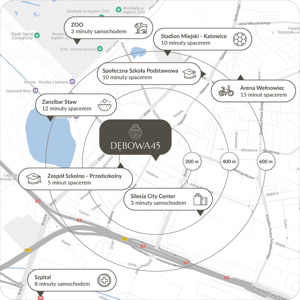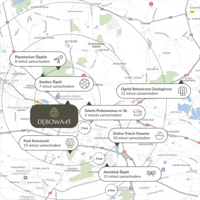 Dębowa 45 to idealne miejsce dla osób ceniących zarówno miejskie udogodnienia, jak i sąsiedztwo natury. Jednym z najważniejszych atutów inwestycji jest bliskość Parku Śląskiego. To atrakcyjna przestrzeń wypełniona roślinnością (z zoo, kolejką linową i licznymi ścieżkami spacerowymi), która zapewnia nie tylko relaks na świeżym powietrzu, ale także doskonałe warunki do aktywnego spędzania czasu. W okolicy znajdują się również liczne sklepy, w tym centrum handlowe Silesia City Center, oraz paczkomaty, punkty usługowe i placówki edukacyjne.